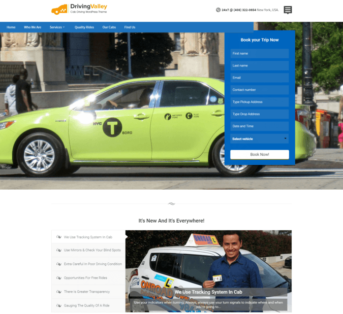 DrivingValley WordPress theme would be an ideal solution for travel agencies, cab services, taxi agencies, auto rickshaw agencies, radio taxis, rental tour bus agencies, hackney carriage, minicabs agencies, etc. DrivingValley is compatible with all the features and functionalities of car rental system, using which you can create a stunning website for your car driving business.