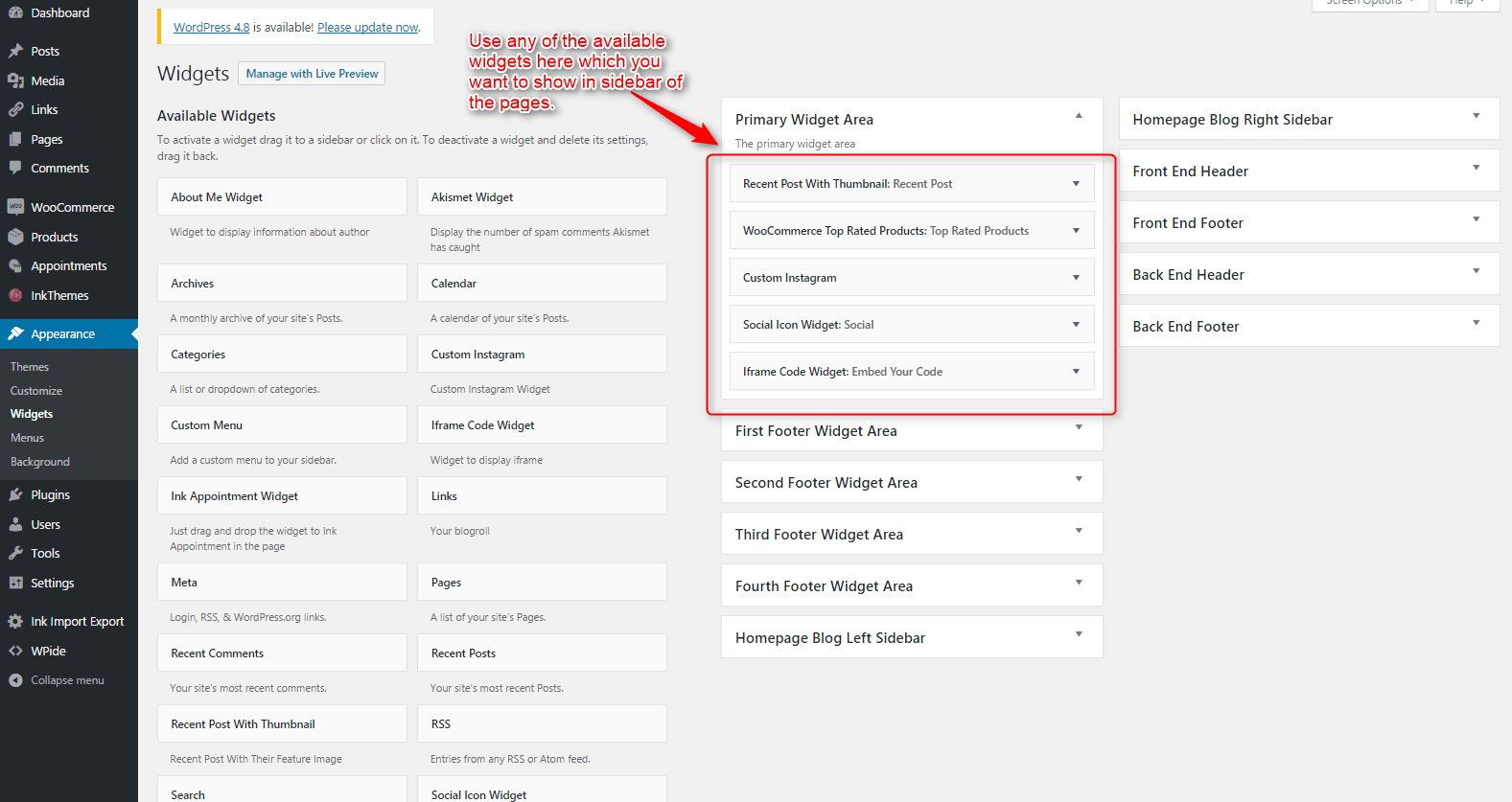 For adding widgets in footer same as sidebar widgets all you have to do is select widgets option from appearance panel , then drag widget of your need & drop it in ‘First footer widget area, second footer widget area, third footer widget area and fourth footer widget area’ according to your requirement, at the end click save button and your widgets are ready to use.